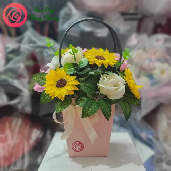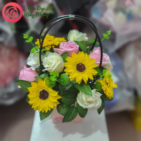 Giỏ hoa sáp là sự kết hợp hài hòa của hoa hồng sáp và hoa sáp hướng dương mang đến một giỏ hoa xinh xắn. Giỏ có 15 bông hoa sáp.