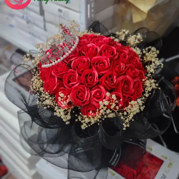 Bó hoa sáp 50 bông tròn, điểm hoa baby, kèm vương miện
